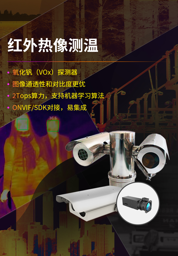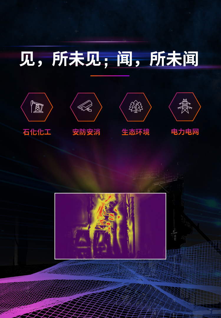 基于红外视觉、机器嗅觉、AI智能分析等技术,产品可应用于红外夜视、森林防火、热像测温、易燃易爆气体检漏、火灾监测等多种场景