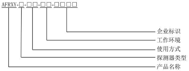 标识由产品名称、红外探测器类型、使用方式、工作环境和企业标识组成。产品名称用“安防热像 仪"的汉语拼音首字母 “ AFRXY ” 表示; 红外探测器类型用 一位大写汉语拼音表示, 制冷型表示为Z、 非制冷型表示为F; 使用方式用两位大写汉语拼音字母表示, 固定平台式表示为GD、移 动平台式表示为YD、手持式表示为SC; 工作环境用两位大写汉语拼音表示 , 室内型表示为SN、室外型表示为 SW; 企业标识用大写汉语拼音字母表示,可自定义扩展汉语拼音字母的位数。