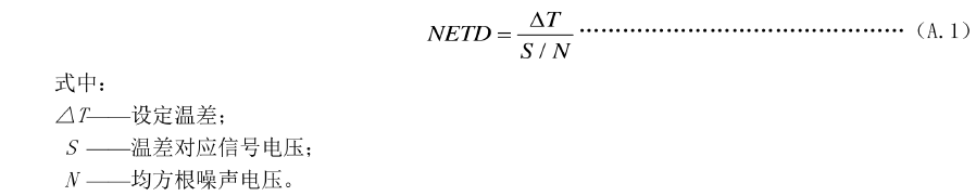 在规定的温度范围内,调节黑体的温差设置,将温差值设置在安防热像仪响应信号的线性区间内, 避免饱和, 温差建议值在0~ 4K之间, 目标图像占全视场至少l O X 10 个图像像素, 分别测晕信号及噪声电压, 按公式 ( A. 1 ) 计算。
