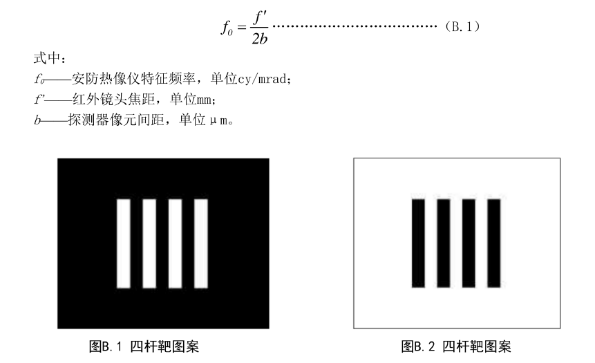 将被测安防热像仪对应特征频率约的四杆靶图案(高宽比为7: 1 ) 的靶标放置在平行光管的焦平面上, 开启安防热像仪电源 , 调整安防热像仪状态, 调节标准温差面源黑体的温差设置(∆T=2K) , 使能在显示屏上清晰成像,先设置为正温差,调节黑体温度使观察者刚能从显示器上分辨出四杆靶图案如图B. 1, 记下此时的温度差∆T1; 再降低温度使其变成负温差 , 并直到再次刚能分辨出四杆靶图案(此时图案亮度反相如图B. 2) 为止, 再次记录此时的温度差∆T2。 (一般采用4位经培训的测试人员, 其中3人能分辨出四标杆图案即可通过测试)