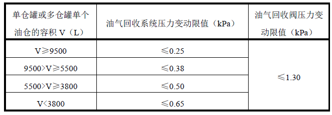 向单仓汽车罐车或多仓汽车罐车的第一个油仓内充压达到 4.5 kPa,5 分钟后记录的压力变动值应小于等于表 1 规定的限值,具体检测应按照以下要求进行。