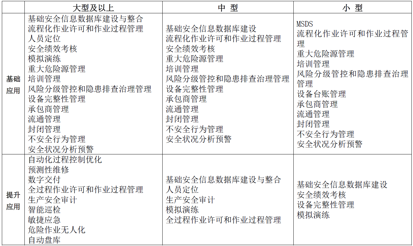 一是企业申报与政府遴选相结合。鼓励符合建设规划要求的企业自愿申报“工业互联网+危化安全生产”试点,各省份根据实际情况遴选有一定基础,有一定代表性,能够覆盖某一细分领域,可以形成可推广成果的企业参加项目试点。应急管理部和地方各级应急管理部门将积极整合资源,建立协调机制, 全力支持入选企业试点项目深入实施。二是分类与分期相结合。试点过程中将根据企业规模、企业现有基础等情况,分类别设定重点建设内容(如表 2),通过三年试点建设,构建“工业互联网+危化安全生产”的初步框架,并在“十四五”期间全面推广。三是单项试点与综合试点相结合。试点过程中将采取单项试点和综合试点相结合的方式。单项试点旨在对某一单项技术、场景或应用进行充分验证,综合试点旨在对多项技术、场景的融合应用进行全方位评估,沉淀一批有实效、可复制、可移植的先进经验和成果并形成相应的技术规范。试点企业可以根据自身条件和发展需要,灵活选择试点方式和试点内容。